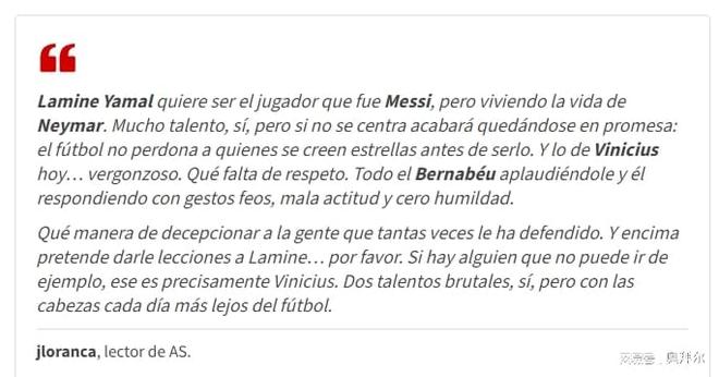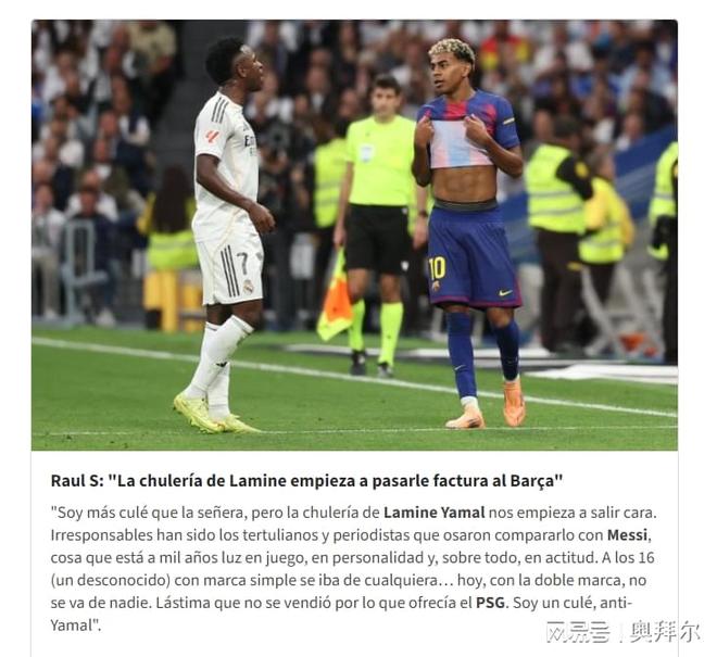 在国家德比之前,亚马尔谈到皇马抱怨裁判判罚时表示,“他们偷窃、抱怨,还搞小动作”。亚马尔的这一言论引发了巨大争议,《阿斯报》皇马版块主编龙赛罗表示,“首先,皇马从不偷窃,也从不支付黑钱。其次,巴萨17年向裁委会副主席支付了840万欧元。”