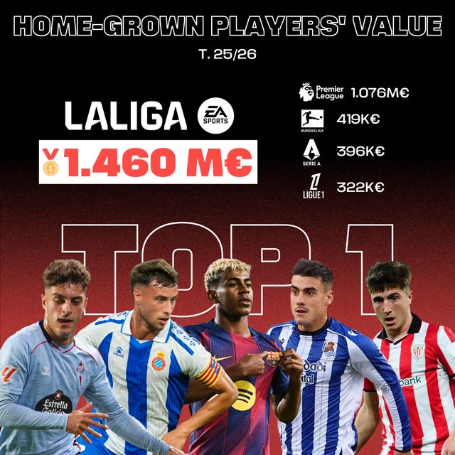 马德里,2025年10月28日– 西甲联盟近日发布了一份关于旗下俱乐部青训体系及本土培养球员的经济与竞技价值分析报告。报告显示,西甲青训球员身价呈稳步上升趋势,以14.6亿欧元的总市场价值领跑欧洲其他顶级联赛。同时,西甲联盟也是本土青训人才使用率最高的联赛。2024/25赛季,俱乐部青训出身球员的出场时间占比达19.8%,该数据同样位居欧洲首位。