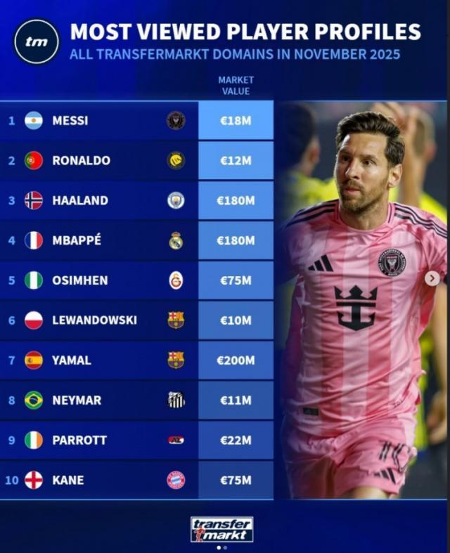 11月德转球员页面浏览量排名:前三依次为梅西、C罗、哈兰德
